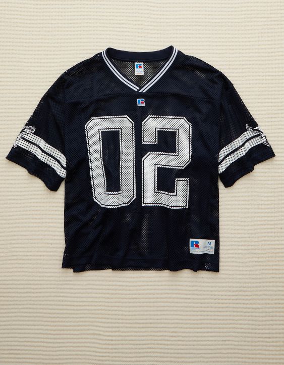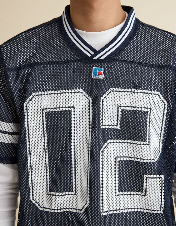 Featuring authentic vintage details like a jock tag and varsity stripes, this football-inspired style in mesh porthole jersey gets updated with a contrast Russell graphic at the front and is ideal for layering over hoodies and more.